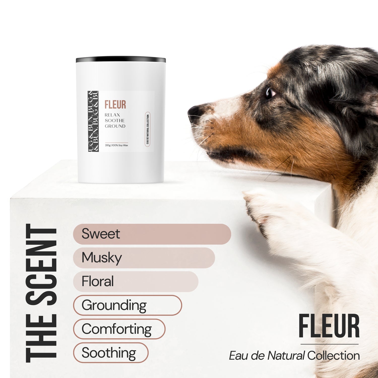 Hand-poured in small batches using 100% soy wax, this Fleur Candle is vegan, cruelty-free and free from palm oil, paraffins, phthalates, synthetic toxins and artificial preservatives. Just pure, elegant fragrance—made for homes with dogs.