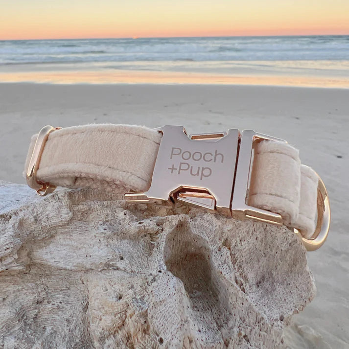 The ultimate blend of luxury and comfort for your furry companion: Pooch + Pup’s stylish, ultra-soft collar. Designed with dedicated pawrents in mind, this collar is perfect for pups who prefer a gentle touch over traditional collars. Its neutral tones are inspired by the delicate beauty of shells found along Australia’s stunning coastline, making it as fashionable as it is functional. Finished with custom gold POOCH + PUP hardware, this collar is a statement of refined elegance.