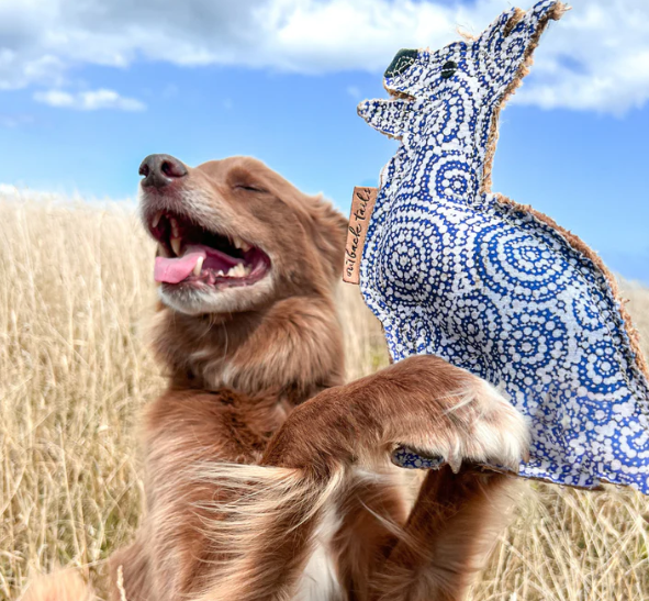Printed with the artwork - Ngama by Patricia Nakamarra Oldfield, this beautiful dog toy raises money for the Aussie Desert Dog Rescue in our artists hometown of Yuendumu. This colourful dog toy is: