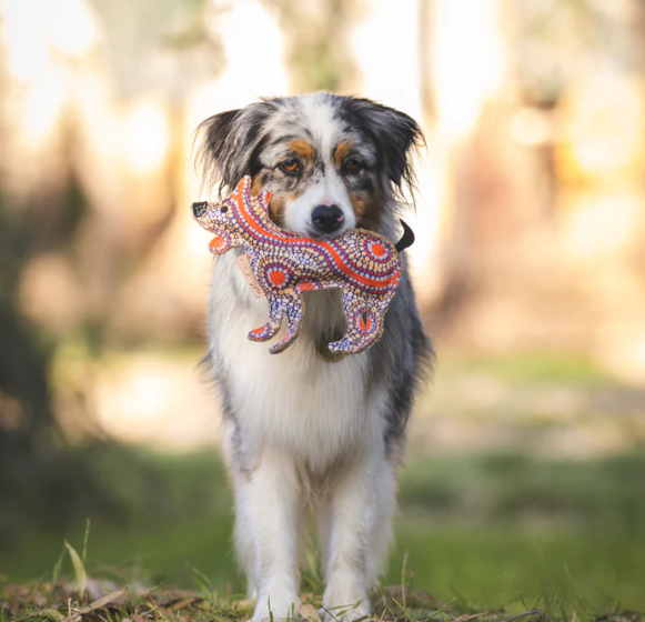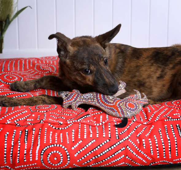 Printed with the artwork 'Snake Dreaming' by Risharna Nakamarra Dickson, this beautiful dog toy raises money for the Aussie Desert Dog Rescue in our artists hometown of Yuendumu. This colourful dog toy is: