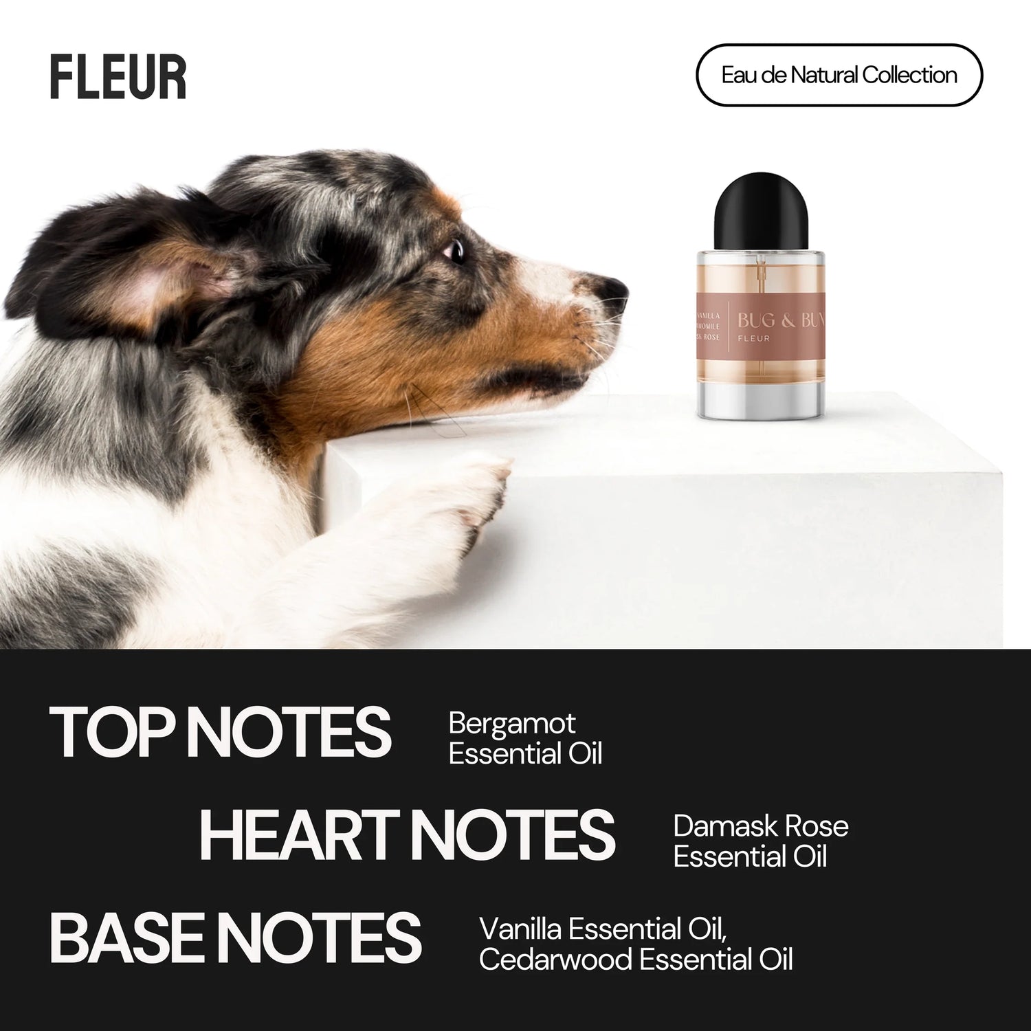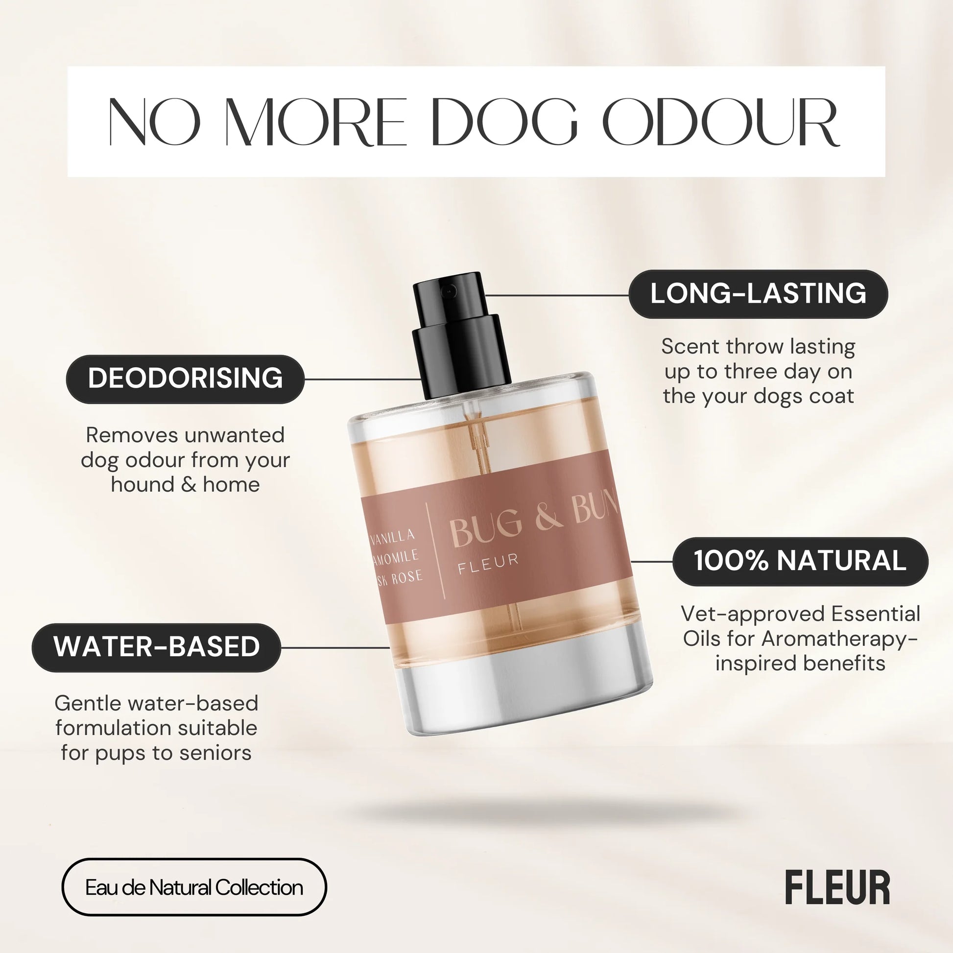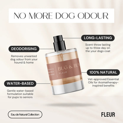 Remove odour while treating your dog to a relaxing aromatherapy-style experience. Combining essential oils renowned to help relieve stress and anxiety, and encourage relaxation, Fleur is an elegant musky, vanilla, floral Fragrance from the 'Eau de Natural' Collection.