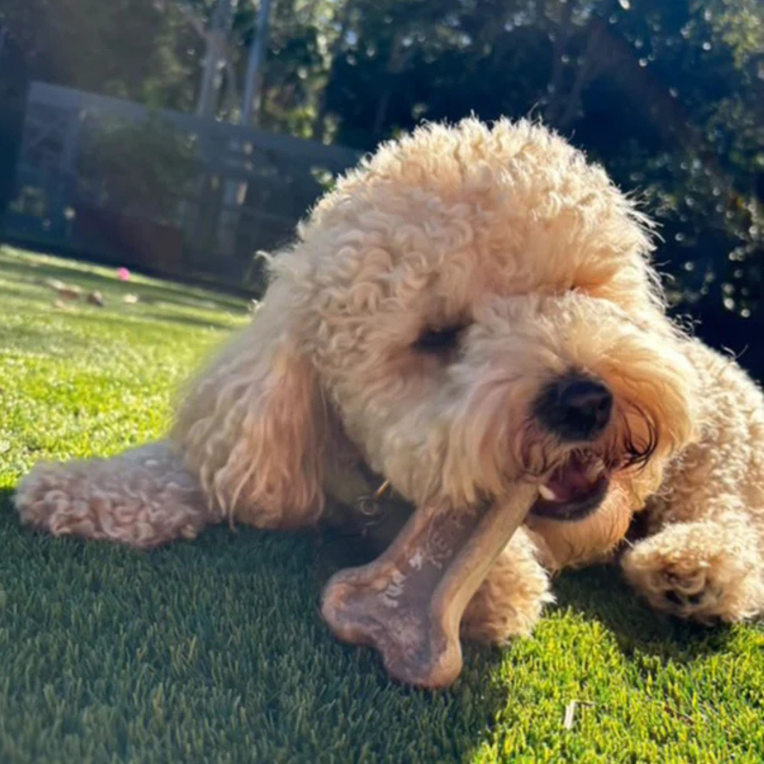 Because it’s made from seaweed and other natural materials, Kelpy Bone is home compostable. If left alone, it breaks down naturally and returns to the soil; no microplastics, no mess, just the way nature intended.