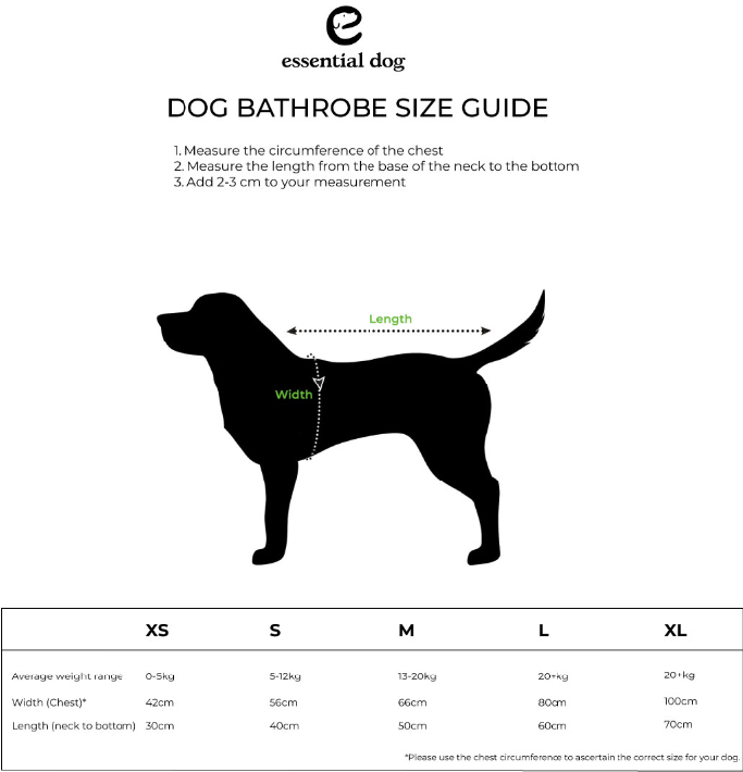 The cotton and bamboo bathrobes are designed for a snug, calming fit—like a gentle hug to help soothe anxiety after baths or big adventures. If your doggo is between two sizes or right on the cusp, we recommend choosing the smaller size to get the full benefit of that snug fit.