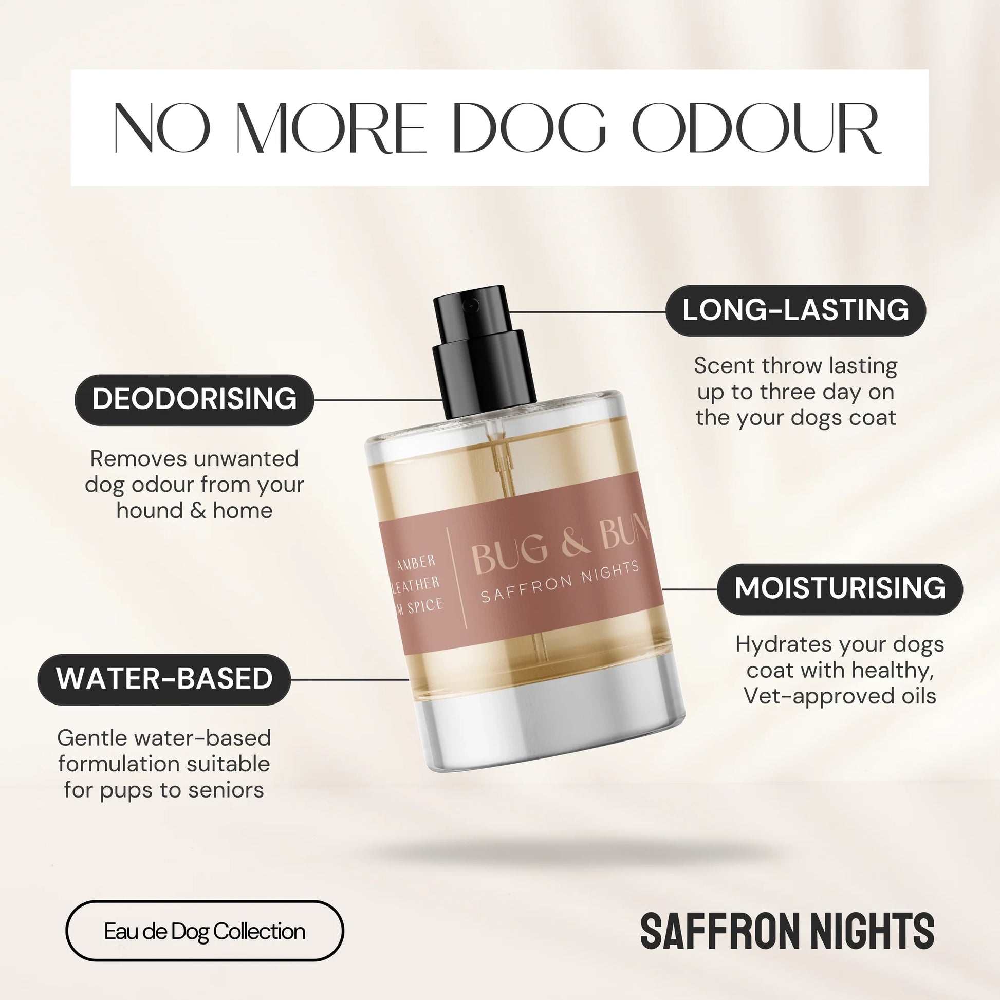 Remove dog odour and treat your dog to this delicious, warm, woody-oriental style Dog Fragrance from the 'Eau de Dog' collection. Designed and handcrafted by Bug & Bun's professional in-house perfumer, Saffron Nights deodorises while instilling freshness and luxury in between dog baths and around the home.