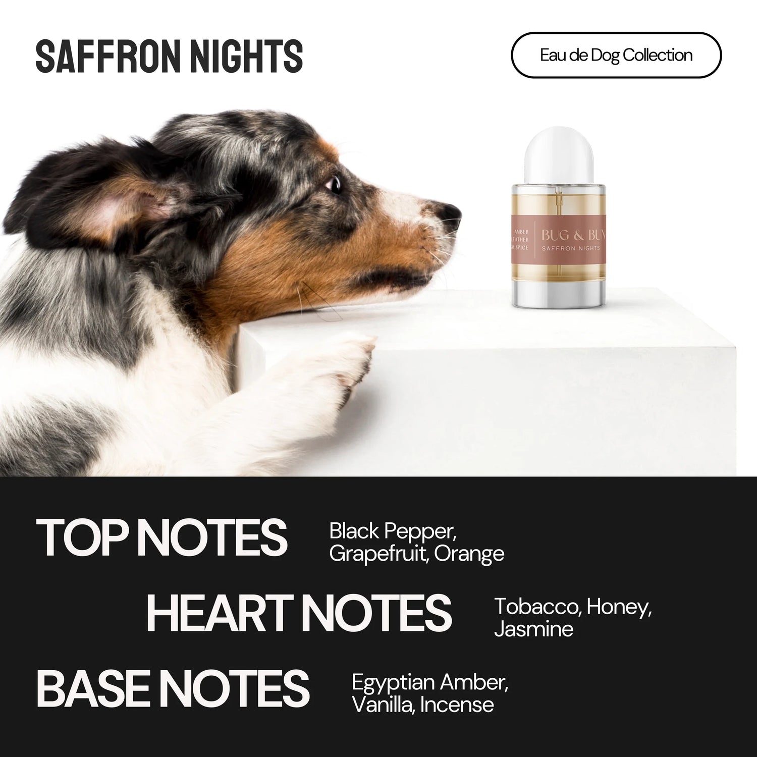 Saffron Nights is a warm, woody and oud-infused dog fragrance for dog owners and lovers.
